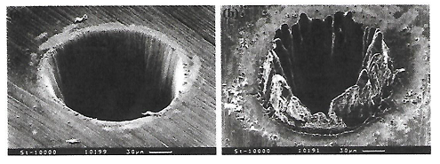 Hole drilling is another application of short-duration high-power lasers, including micro-machining in metals and ceramics, micro-patterning of semiconductor surfaces, and machining biomedical stents [2]. Atto-sec (10-18 s) lasers are used in the study of molecular dynamics. In the micro-machining of metals, semiconductors, and plastics, cleaner and better-defined holes are drilled with fs lasers at lower energy density than possible with ns and microsecond (µs) pulse duration lasers. Figures 1 and 2 illustrate this difference. With longer pulse lasers, interaction with the material occurs, and a plasma is generated that absorbs energy and causes melting instead of ablation. Ultrafast laser pulses efficiently deposit energy directly into the material to cause deep ablation.