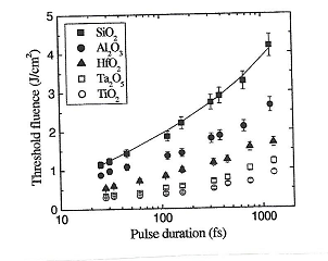 The band energies for the oxide materials studied ranged from 3.3 eV (TiO2) to 8.3 eV( SiO2) [4]. Pulse durations ranged from 25 fs to 1.3 ps (10-12 s). The threshold fluences (J/cm2) for each oxide are plotted compared to its pulse duration in Figure 3. Short pulse durations exhibit lower LIDT, and high-band gap materials survive higher LIDTs.