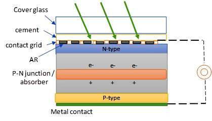 The upper electrode is a fine gold wire grid produced by photolithography or by screen printing silver that is then fired. Contact is made to the grid, and to construct a panel many cells are joined in parallel and serial sets to produce the desired panel voltage and current (power). The small loss imposed by the metal grid is tolerated in the interest of economy for terrestrial cells. Developments are underway to replace it by a transparent conductor layer such as indium-tin-oxide (ITO) and other transparent conducting oxides (TCO) for higher performance cells such as those used in space power. The metal electrode at the bottom is often a reflective deposition that returns some photons for a second pass.