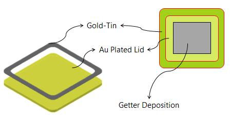 In this approach, getter materials are deposited to the unused middle area of the lid. As the gold-tin preform melts to seal the package, the getter also activates thermally and absorbs gases. This option requires Materion-manufactured Getter Combo-Lids to be masked, as the deposit getter is created by thin film deposition.