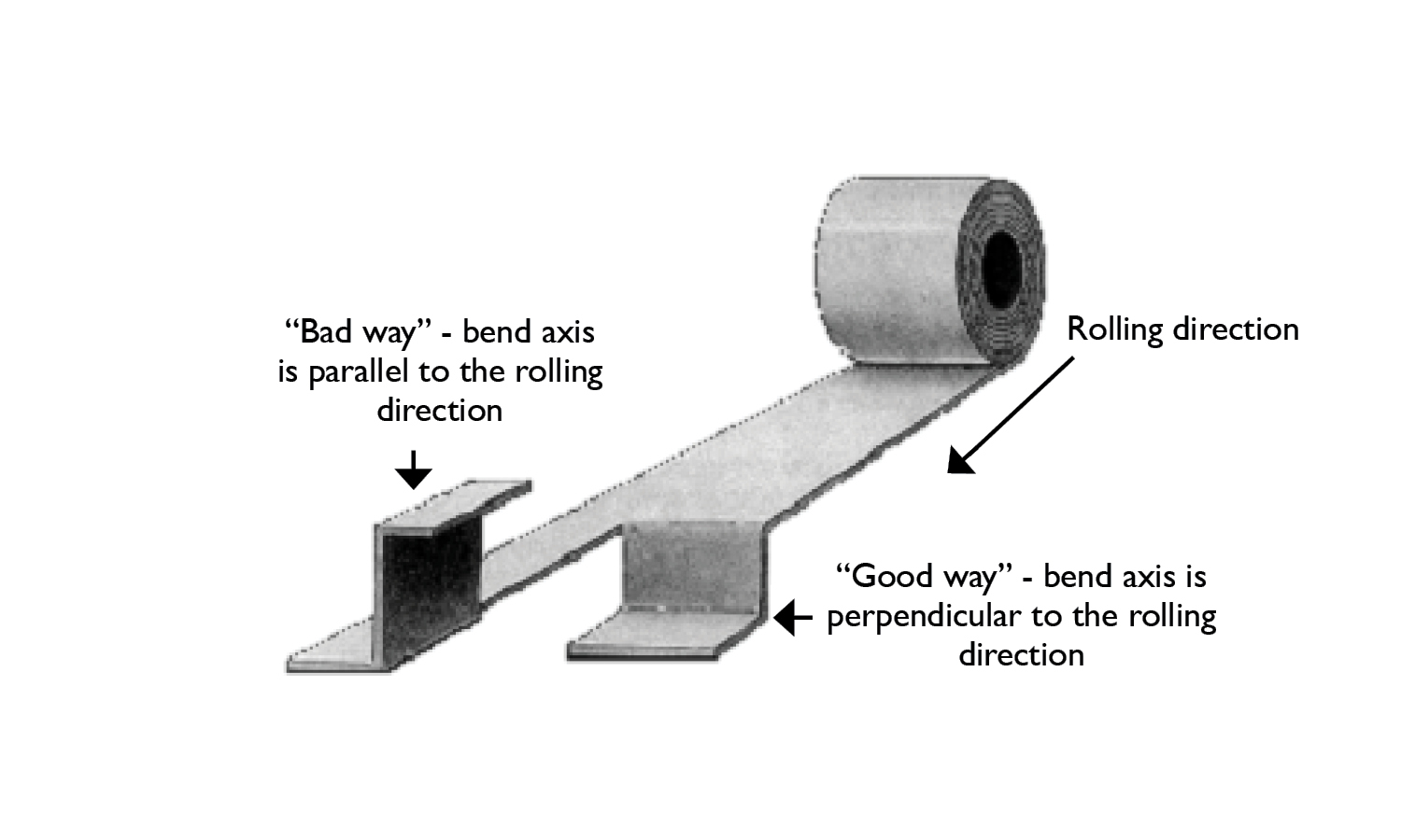 The orientation of the bend relative to the rolling direction of the strip is important. Strip alloys typically are more formable when bends are made in the longitudinal (good way) direction than bends made in the transverse (bad way) direction (Figure 3). Therefore, formability is specified in both the longitudinal and transverse direction. This directionality increases with the amount of cold work in the metal. This is important since many dies are oriented to produce parts with bad way bends.