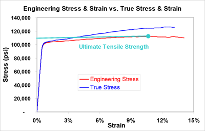 Figure 1. Example Chart of True and Engineering Stress-Strain Curves of Alloy 17410 HT