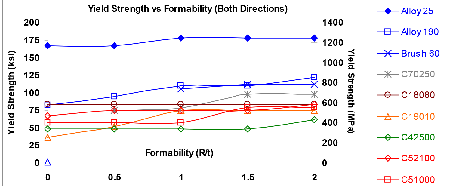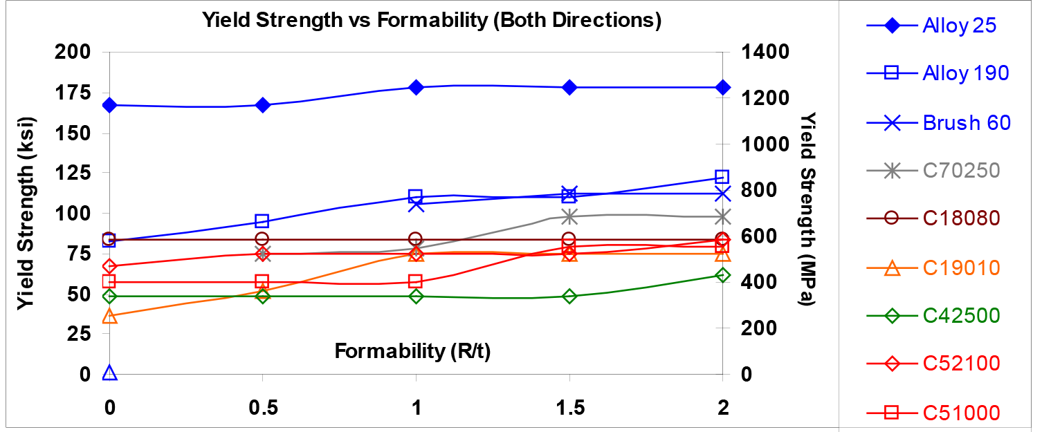 When designing a contact, materials with greater yield strengths will usually provide greater design flexibility by allowing for higher stress levels. However, since formability generally tends to decrease as yield strength increases, higher strength tempers of a given material will offer less design flexibility than the lower strength tempers. That means it is imperative to find the material with the highest strength that also meets the formability requirements of the design. Figure 2 below shows the 0.2% offset yield strength as a function of formability for copper alloys commonly used in connector applications. The copper-beryllium alloys shown in blue offer the greatest yield strength for a given formability level, and vice versa. These alloys will provide designers with the optimal amount of flexibility for a given strength level.